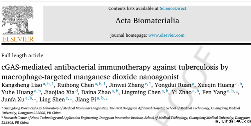 近日,我校免疫与感染性疾病研究团队在Acta Biomaterialia(中科院一区,IF=9.4)报道了靶向结核感染巨噬细胞cGAS介导自噬通路的抗结核新策略,开发了一种巨噬细胞靶向的二氧化锰纳米材料(Tuf-Rif@HA-MnO2 NPs),不仅可以实现抗结核药物的巨噬细胞靶向递送,且进入巨噬细胞后能与胞内谷胱甘肽(GSH)反应,直接在感染巨噬细胞内释放二价锰离子(Mn2+)以激活其cGAS通路、及其介导的自噬,从而进一步增强巨噬细胞、DCs、T细胞的抗结核免疫保护功能。结果显示Tuf-Rif@HA-MnO2 NPs能结合靶向药物递送和cGAS-自噬介导的抗结核免疫保护功能,以更有效、协同地抑制Mtb感染、减轻结核病损,该策略有望用于开发更有效的结核病或耐药结核病宿主导向治疗新方案。