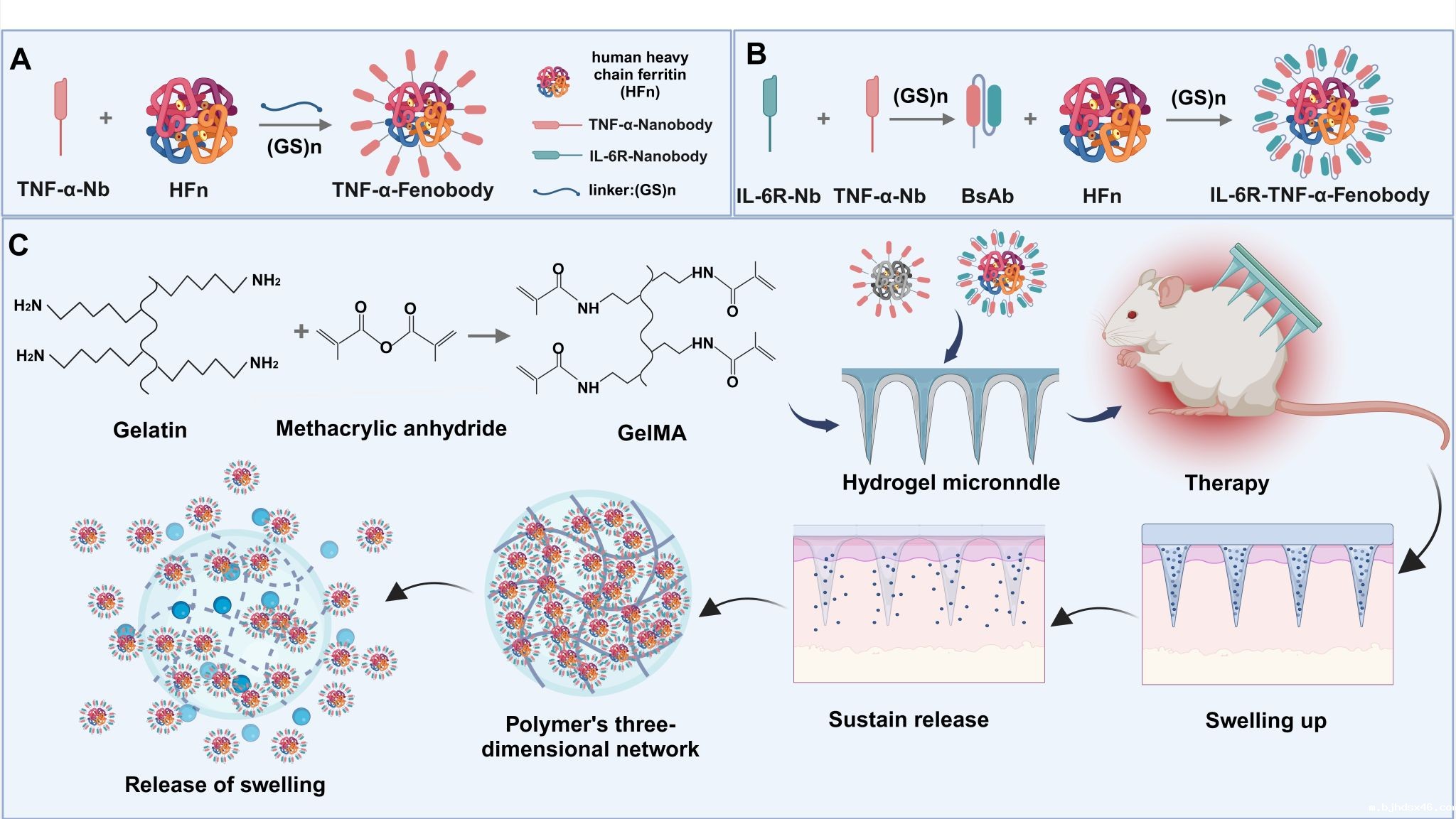 图注:微针介导的IL-6R-TNF-α-Fenobody双特异性纳米抗体持续缓释递送系统用于治疗类风湿关节炎