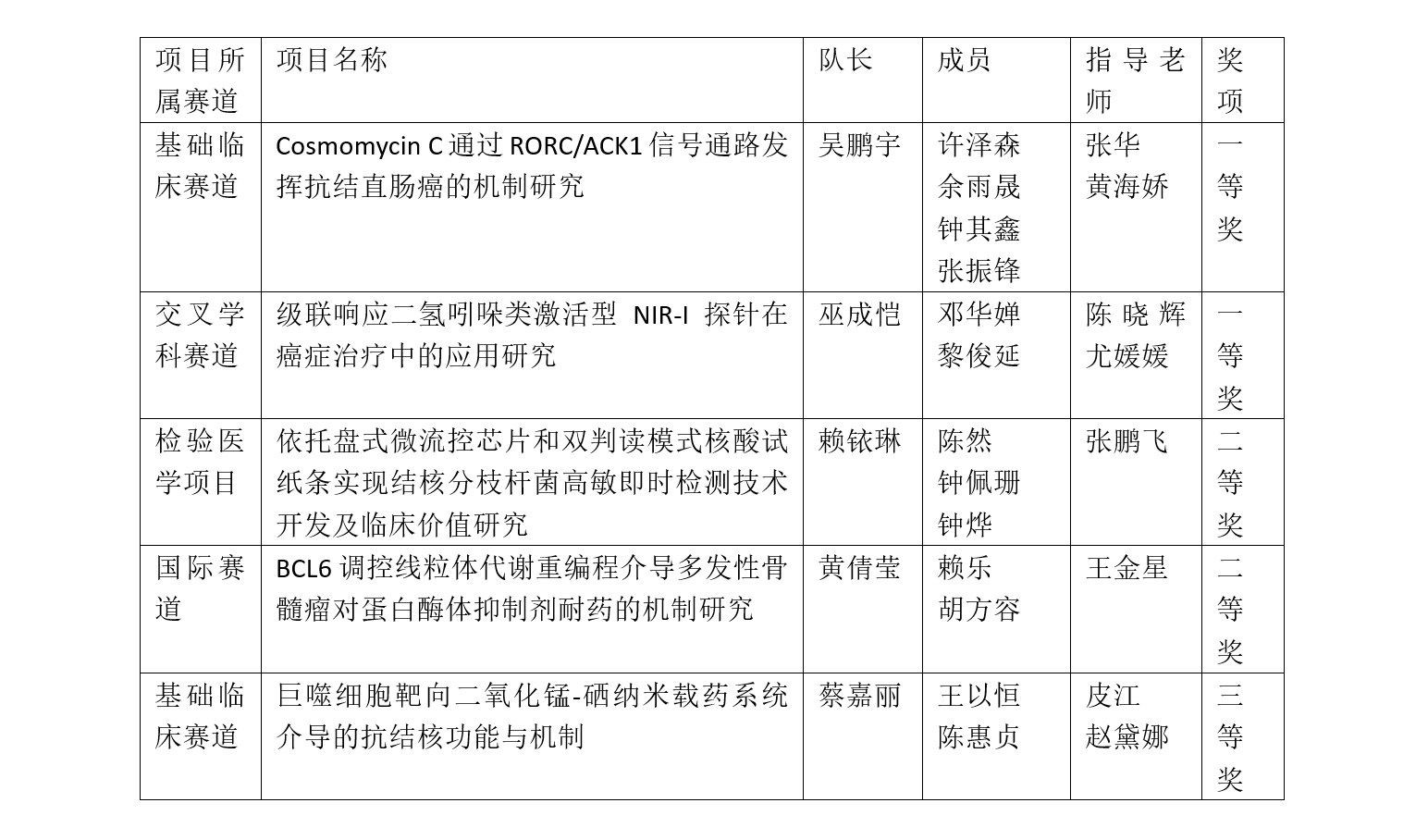 2025年7月5日至7日,第十一届全国大学生医学创新大赛药学中医药、交叉学科及国际竞赛复赛在湖南中医药大学隆重举办,共吸引了来自 207 所高校的1108个作品;7月19日,第十一届全国大学生医学创新大赛暨“一带一路”国际竞赛基础临床赛道西部和中南部赛区复赛在暨南大学隆重举办,吸引了西部和中南部109所高校同台竞技。本次赛事由高等学校大学生医学创新竞赛委员会主办,赛事规模创历史新高!星空游戏官方网站入口共有5支队伍通过校赛进入各赛道复赛,最终获得一等奖2项,二等奖2项、三等奖1项(如下表所示)。根据赛事规则,荣获一等奖的2支队伍成功晋级全国总决赛。