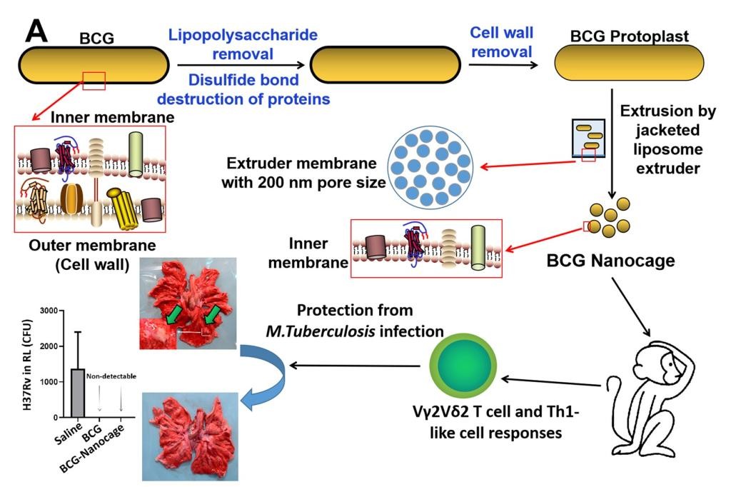 该研究中,作者将BCG细胞壁清除后,通过生物纳米技术将1-5微米大小的BCG原生质体改造成约200纳米的BCG原生质体纳米颗粒(命名为BCG-Nanocage),BCG-Nanocage保留了BCG的高巨噬细胞靶向作用和激活巨噬细胞抗结核免疫作用的功能,而细胞毒性却较BCG显著降低。BCG-Nanocage在体外和猕猴体内均可显著诱导出Vγ2Vδ2 T细胞免疫反应,接种BCG-Nanocage猕猴受到结核分枝杆菌攻击时,Vγ2Vδ2 T细胞能快速聚集到肺部以抵抗感染,从而有效清除猕猴肺部结核分枝杆菌、并保护其肺部病理损伤。这项研究预示生物纳米技术在疫苗构建和改造中广阔的应用前景,并为更有效的结核疫苗开发提供了新的方向。