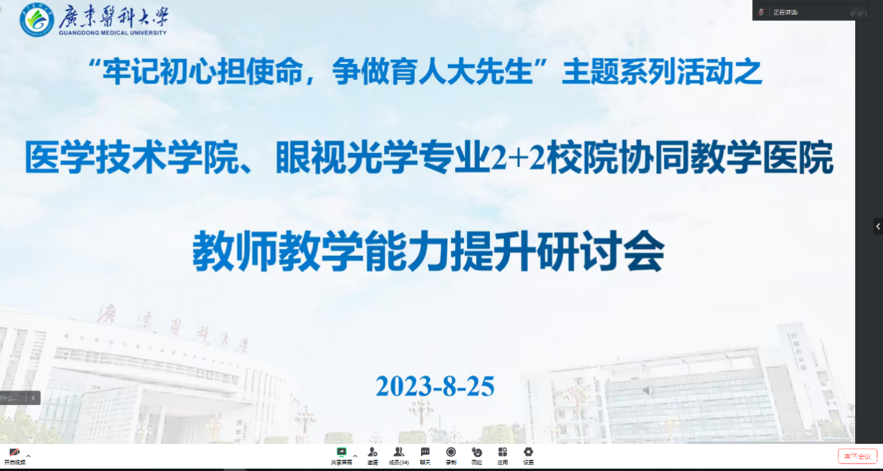 聚焦当前教育改革发展新形势,构建办学理念体系,深化课程教学改革,提升教师教学技能。2023年8月25日下午,星空体育下载举办了“牢记初心担使命,争做育人大先生”主题系列活动之星空体育下载、眼视光学新专业2+2校院协同教学医院(xingkong体育官网登陆附属第二医院、xingkong体育官网登陆附属东莞第一医院)教师教学能力提升研讨会。会议特邀天津医科大学眼科医院党委书记魏瑞华教授、天津医科大学眼科医院视光中心主任杜蓓教授和眼视光学院教学办公室李静主任做眼视光专业教学能力提升和人才培养相关主题报告,星空体育下载和视光学新专业2+2校院协同教学医院专业授课教师参加本次培训。会议由星空体育下载分管教学工作的阮杰副院长主持。
