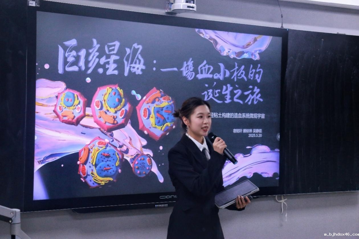 八支参赛团队围绕血液系统核心主题展开角逐,通过粒细胞系统、红细胞系统、淋巴细胞系统、巨核细胞系统、单核细胞系统等模型的动态演绎,系统解析细胞发育阶段中胞体结构、核仁、染色质等细胞结构变化及功能特性。值得一提的是,部分团队创新引入互动体验环节,不但鼓励在场的同学们主动回答,并且邀请评委参与模型组装制作过程,生动阐释血小板生成机制,将现场氛围推向高潮。