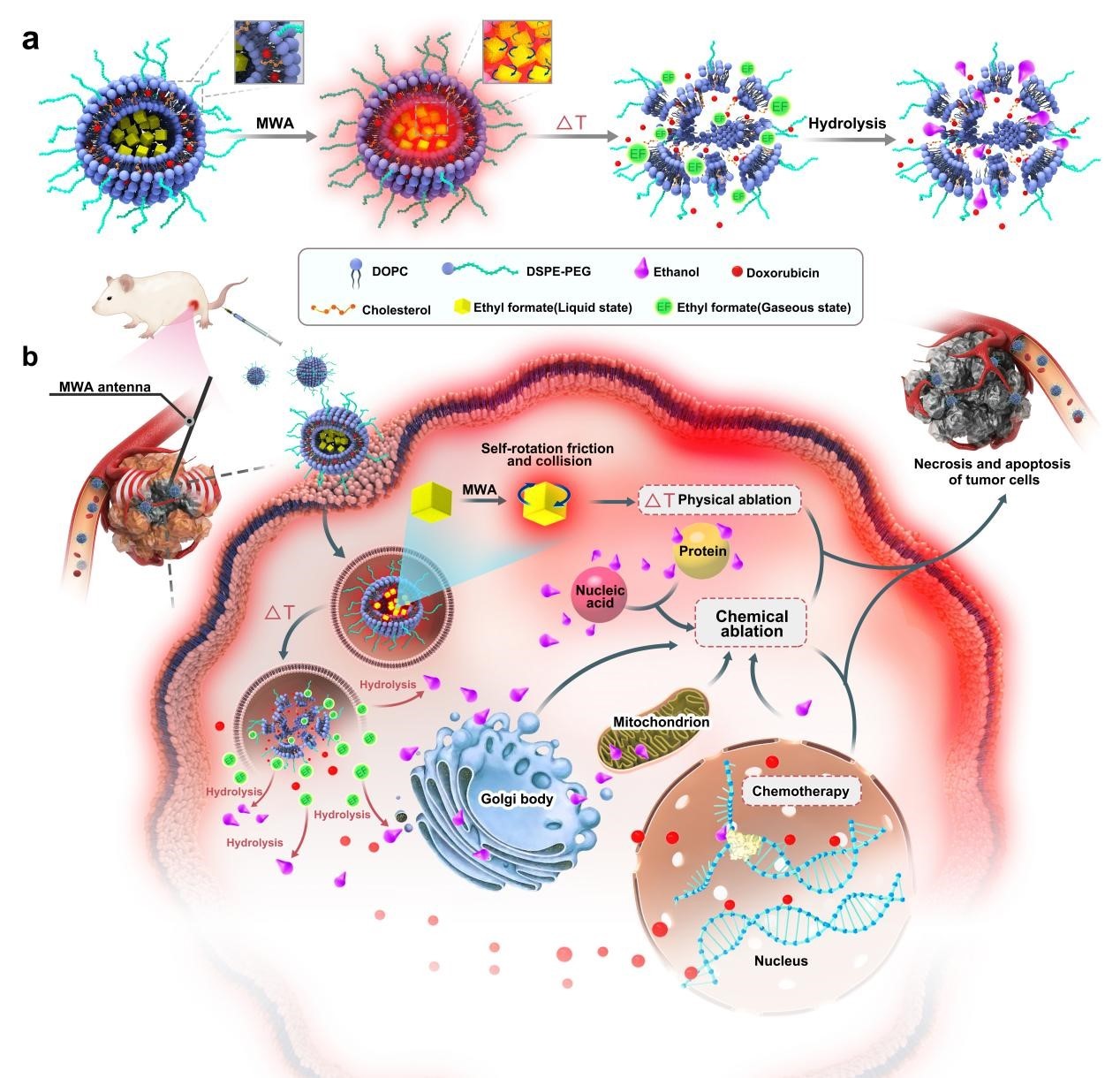 目前,微波能向热能转换效率低是临床微波消融实体肿瘤的难题之一。尽管负载金属离子的纳米颗粒能够增加微波能到热量的转换,但其不可避免地导致细胞内离子稳态失调会严重损害正常细胞或组织,限制了其临床应用。该研究中,作者设计并制备了一种非离子微波增敏剂,该增敏剂将甲酸乙酯(EF)和阿霉素(DOX)封装在脂质体(EF-DOX-Lips)中以加强微波消融(MWA)进行抗肿瘤治疗。EF-DOX Lips的综合效应包括EF增强的微波热转换效率、EF代谢触发的化学消融,EF汽化增强的空化效应和DOX释放。上述多种抗肿瘤机制协同强力诱导肿瘤细胞死亡,抑制肿瘤增殖和血管生成,从而改善原发性肝癌(HCC)小鼠的生存预后。非离子型微波增敏剂可以避免因金属离子细胞内富集引起的细胞稳态失调和器官功能损伤,具有很高的临床转化潜力。