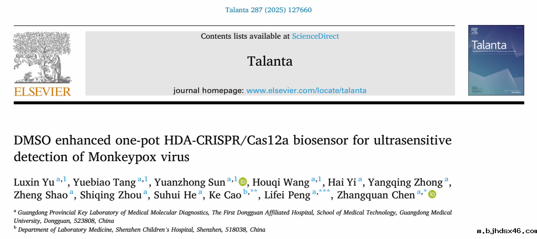 近期,星空游戏官方网站入口陈章权团队在Talanta(中科院1Top)上发表了题为“DMSO enhanced one-pot HDA-CRISPR/Cas12a biosensor for ultrasensitive detection of Monkeypox virus”的研究性论文。我院陈章权教授,基础医学院彭礼飞教授与深圳儿童医院检曹科教授为通讯作者,我院余路新博士与研究生唐跃彪、孙元中、王厚淇为该论文共同第一作者。