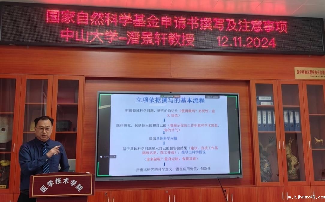 20241112日,中山大学潘景轩教授应邀来我校星空体育下载开展题为《国家自然科学基金标书撰写及注意事项》的学术讲座。会议由星空体育下载院长张华主持,星空体育下载党委书记阮杰以及星空体育下载、公共卫生学院、药学院等部份师生代表参加了本次讲座及交流座谈会。