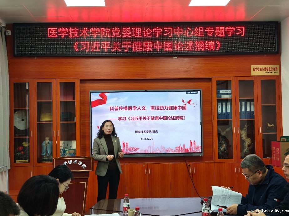 会议第一项议程,学院党委书记阮杰领学《习近平关于健康中国论述摘编》,强调我们要结合学习《摘编》,深入贯彻落实党的二十大和二十届三中全会精神,坚定不移走中国特色卫生与健康发展道路,不断提高人民健康水平,全面推进健康中国建设,努力开创我国卫生健康事业新局面。在深化教育综合改革中,我们要“强化科技教育和人文教育协同”,培养科研领先、医术精湛、医德高尚的医学人才。